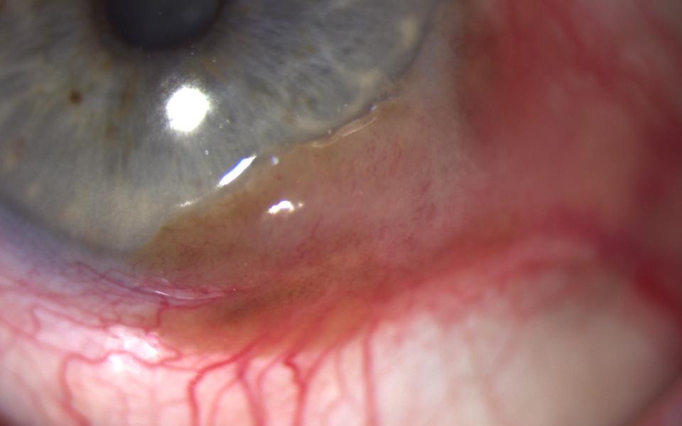 This 85 caucasian female presented with a large left temporal limbal lesion measuring 9 x 3 mm. There was mild pigmentation to large feeder vessels and adjacent PAM. Initial topical treatment with